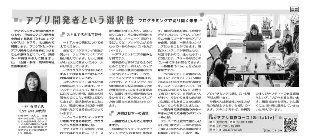 沖縄の地元紙「琉球新報」様へ6月9日より記事広告を掲載いたしました。